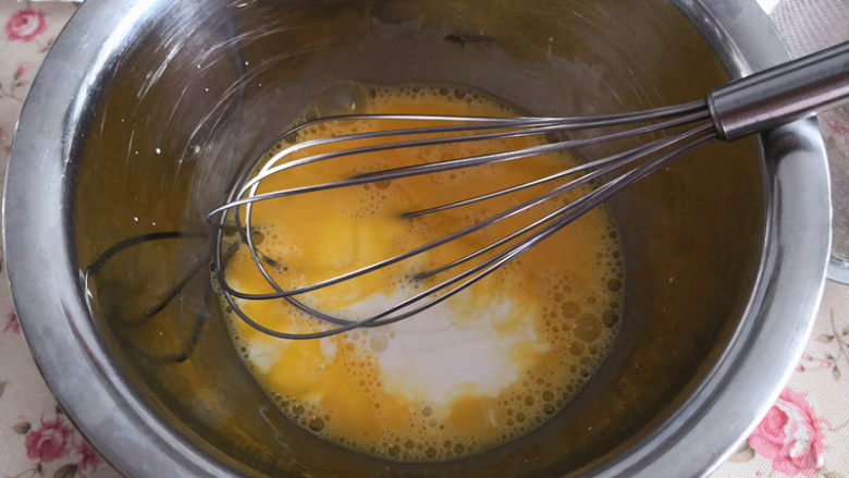 1. 2个蛋黄与1个全蛋放入干净无水无油的容器里,加入牛奶拌匀,