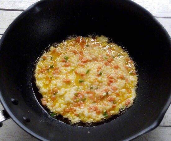 5. 起锅,热油,下入搅拌的米粒蛋液摊成饼状,用中小火煎制蛋液凝固(期间可以轻微摇晃几下防止粘锅)