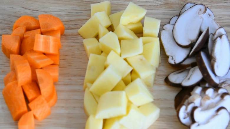 4. 土豆、胡萝卜切小块,香菇切片。