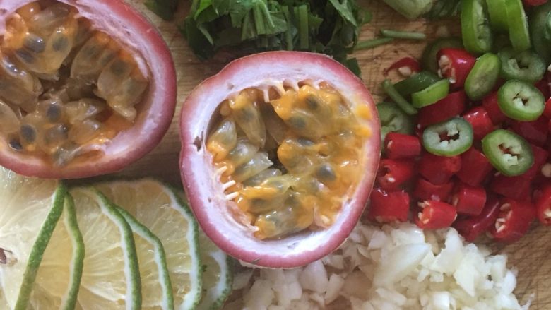 7. 切好配料香菜、青红椒、蒜头、青柠檬、百香果备用