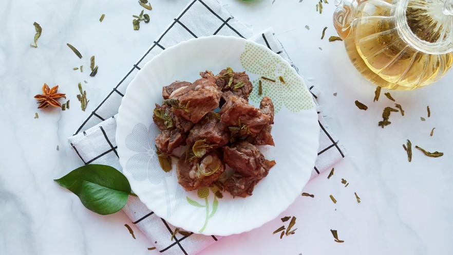 免去了煎炒的过程,少油更清爽,龙井茶味清淡,不会抢了排骨的味道,且去腥解腻效果极佳