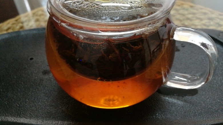 4. 浸泡五分钟,茶汤深红似琥珀,用电陶炉煮开茶味更浓郁。