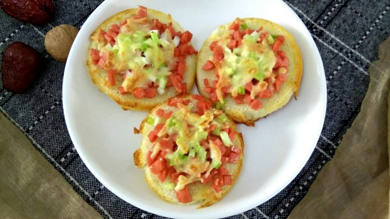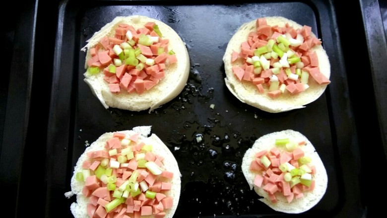 买个馒头切片,上面放点火腿丁,香葱,随自己的喜爱,也可以放点洋葱,西红柿,最后放上芝士。放入烤箱十分钟就OK啦!成品香酥好吃😊
