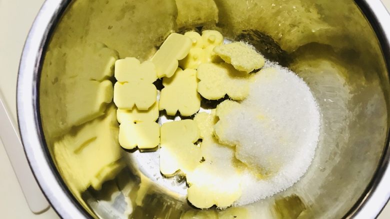 2. 黄油软化,至轻压变形即可。加入细砂糖打发