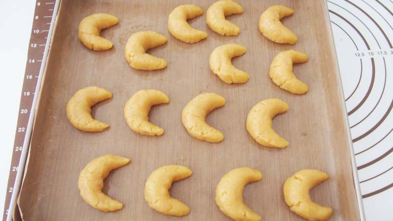 7. 捏成月牙的形状,将面团放入铺了高温油纸的烤盘上。中层上下火,170度,20分钟左右即可