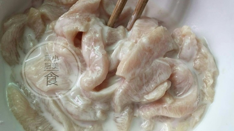 6. 放生粉,少许清水,盐,味精搅拌成湖,就是裹上糊的鸡肉夹加起来不滴水就可以了。水不能多放多湖就挂不住。
