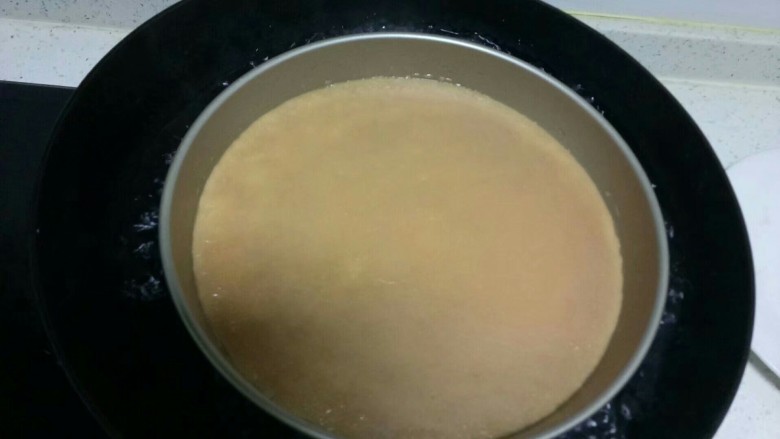 6. 披萨盘上均匀抹油,倒入适量面汁晃云,放入烧开水的锅中,中火盖盖煮汁面皮中间气泡鼓起来。