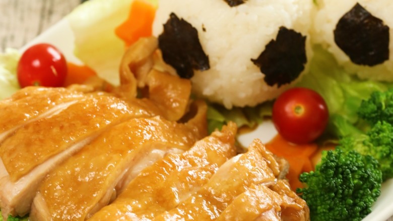 11. 热锅倒油,小火慢煎鸡腿,煎3分钟~翻个面,再煎3分钟,然后夹出~将鸡腿放入干净的锅中,加水没过一半的鸡腿,加入酱油、糖,煮5分钟,然后翻个面,再煮5分钟~捞出鸡腿切块摆盘,淋上汤汁,足球便当就做好啦~