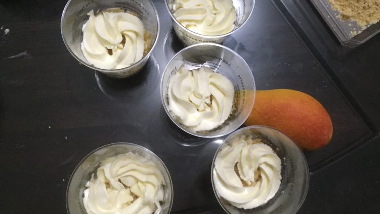 7. 淡奶油装入装有裱花嘴的裱花袋里后挤入一层奶油到杯子里