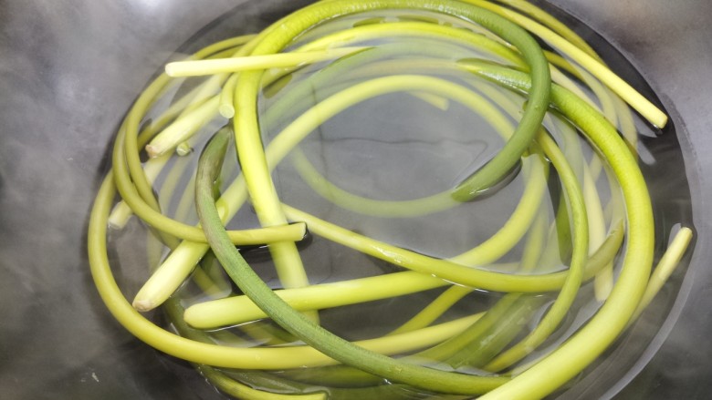 1. 先把水烧开,把蒜苔放进锅里煮。