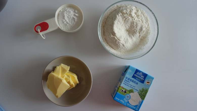 1. 准备好所有的食材,黄油充分软化。夏天放在室温很快就可以变软了,冬天可以放在微波炉高火转10秒左右。