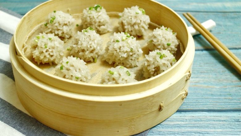 6. 取适量肉泥团成小圆子,裹上糯米,在手里再团一下巩固一下