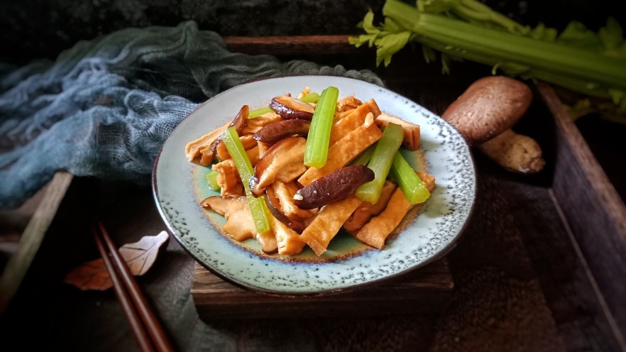 4. 加入香菇也是炒至变色,香菇比较吸水,所以需要加入适量的水炒