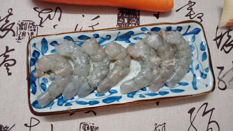 4. 红萝卜去皮切成5毫米的薄片,多少只虾就切多少片红萝卜片