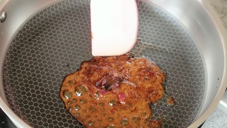 6. 锅内倒入适量食用油,放入红糖(可以用冰糖代替)。
