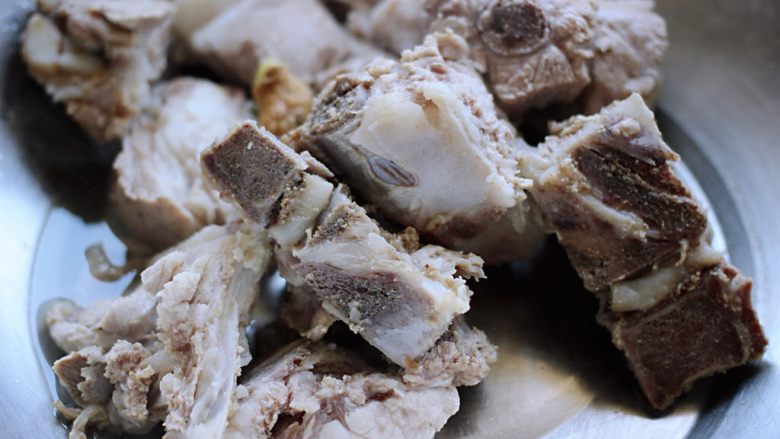 4. 焯过水的排骨用清水冲洗干净后沥干水份