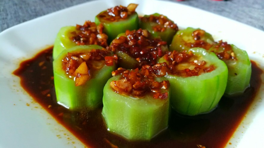 8. 把蒜蓉汤汁淋在蒸好的丝瓜上面即可
