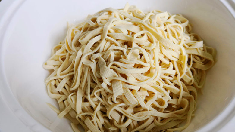 1. 豆腐皮买回来先用清水冲洗掉表面的粘膜,切成丝,