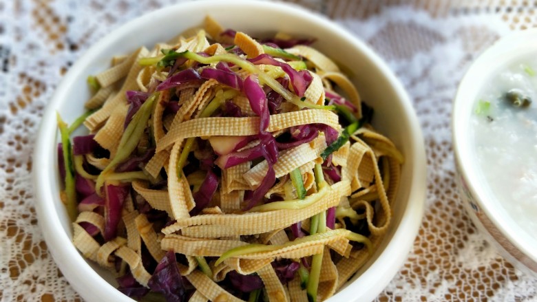 夏天三十几度炒菜真是热得够够的,吃点凉菜简单省事儿还吃得舒服,有一天冰箱里刚好有紫甘蓝,青瓜,豆腐皮,就切丝一起拌了,没想到这一拌还特别好吃,无论从颜色搭配还是口感都特别棒!清新爽口。