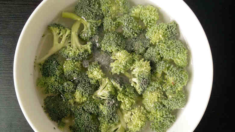 2. 西兰花用适量淡盐水或淘米水浸泡洗净,捞出;用淡盐水或淘米水清洗的食物会特别干净;
