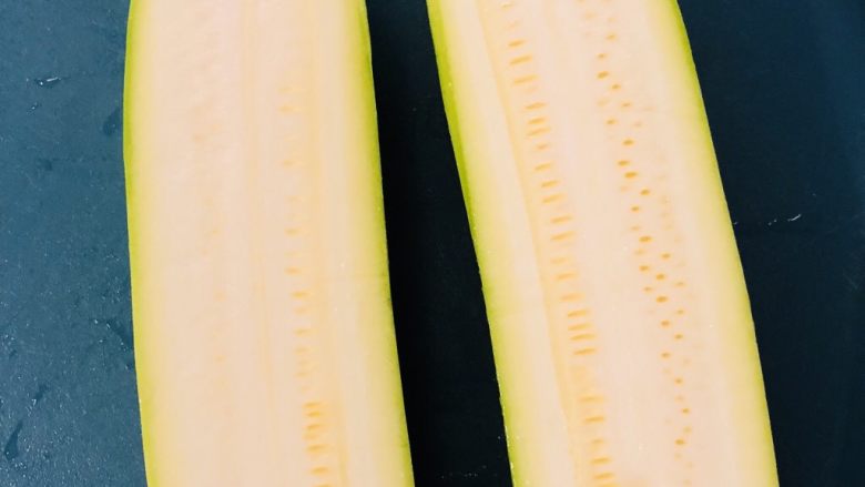 3. 生瓜一根,去皮,对半切开,切开后再对半切。再横过来切片。