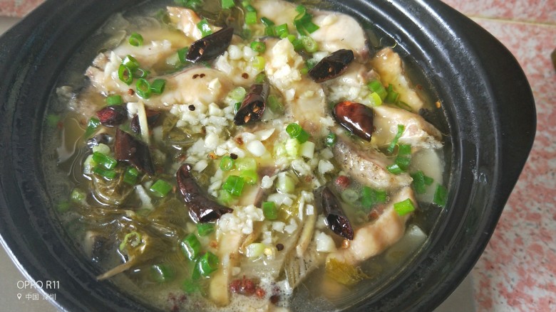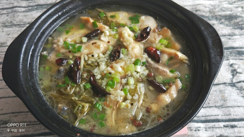 11. 放入鱼块儿至鱼块七八分熟关火,关火后砂锅还会沸腾一会儿,余温完全可以焖熟鱼块,酸菜是咸的,鱼肉腌制过,不用放盐