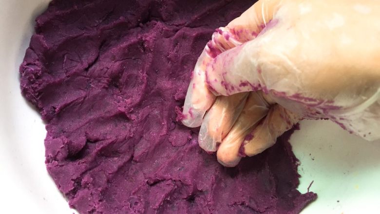 10. 紫薯泥里加入面粉,用筷子拌均匀