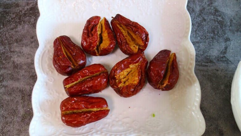 4. 将搓好的糯米面条放在红枣中间捏捏紧蒸十分钟。