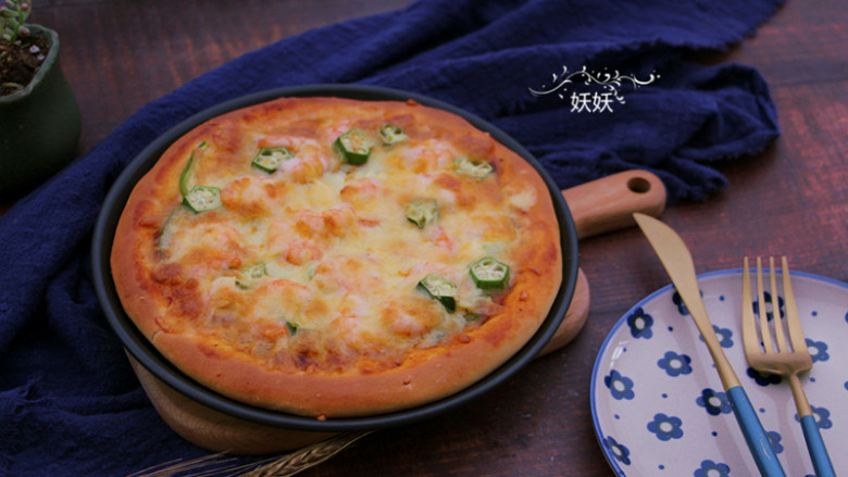 虾仁的披萨,配菜用到了秋葵和青椒,本来是要加些洋葱的,但是切菜的时候忘记了,就多放了些虾仁来充实,口口下去都有虾,特别好吃,一般用到海鲜或者汁水比较多的食材的时候,我会先把馅料炒一下,防止烤制的过程中渗出太多水分,但是这次的虾仁是新鲜无污染,纯野生散养的虾,虾的品质够好,就可以不用先炒。