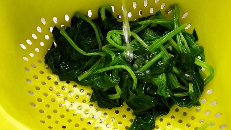9. 菠菜焯水1分钟捞出过凉水(纯净水)冷却,挤出水分;