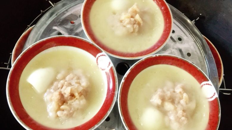 4. 碗底抹油,放入少量海蛎干粉做底,加入猪肉团,一个鹌鹑蛋,倒入米浆。
