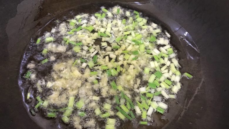 4. 小葱洗净之后切成圈,葱白部分和生姜末放一起