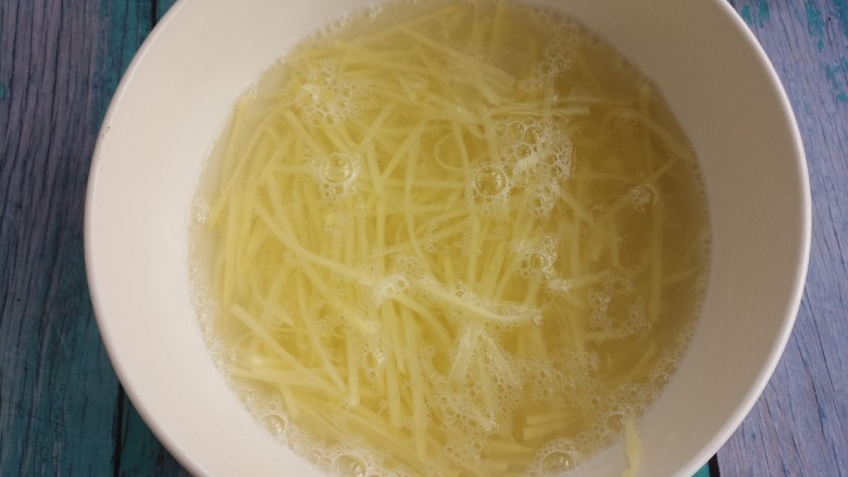 3. 把土豆丝放在水里泡一下,去除淀粉,变炒的时候不粘锅。