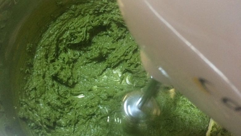 4. 倒入抹茶糖粉,先用刮刀稍微混合一下,再用打蛋器搅打均匀。