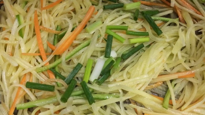 8. 倒入胡萝卜丝和青尖椒丝快速翻炒。