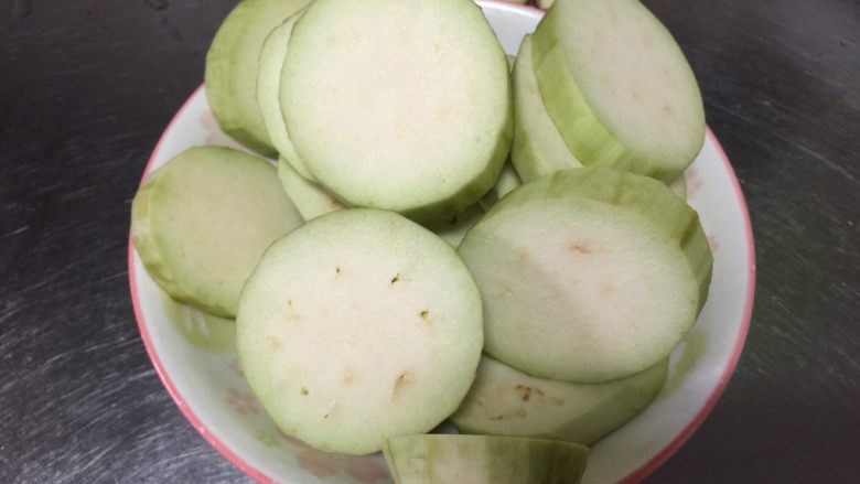 1. 长茄子削皮切圆厚片(用盐水浸泡半小时,可以省油)