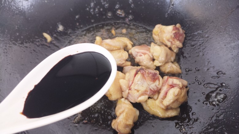 7. 冰糖溶化呈棕红色。加入鸡腿炒。