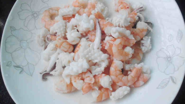 3. 鱿鱼去掉黑皮治净,打花刀的再切小片;虾去壳挑去虾肠虾线