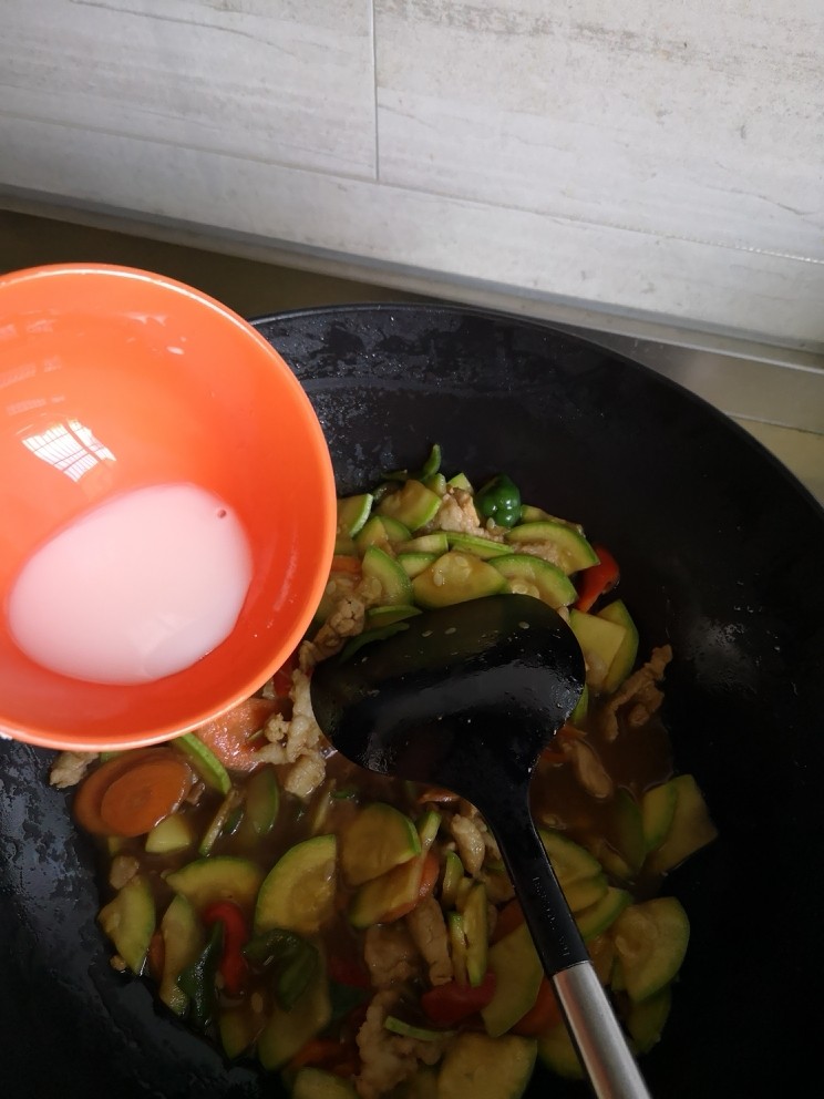 15. 淀粉用冷水稀释 倒入锅中 迅速翻炒均匀