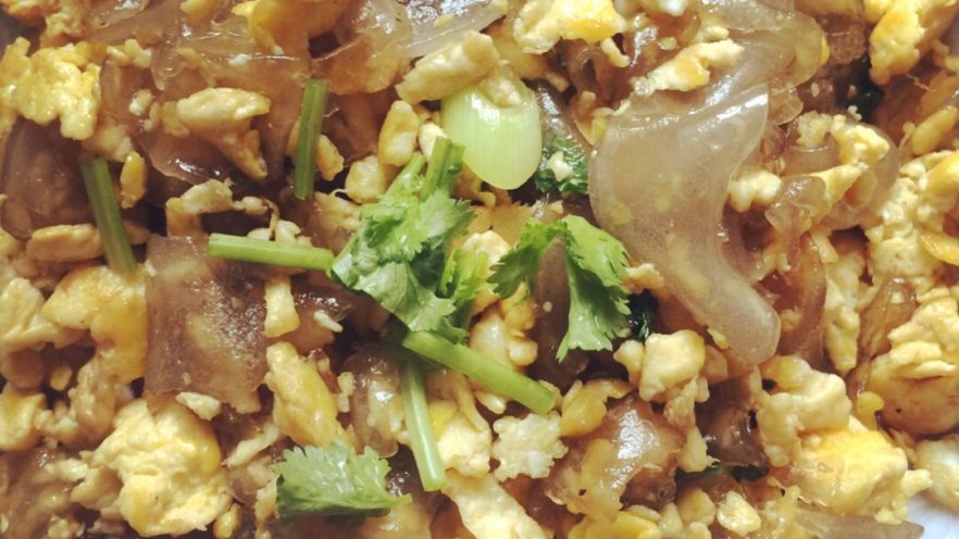 2. 热锅放油,倒入打散的鸭蛋,稍微定型后,用铲子搅散,成型以后盛出备用。