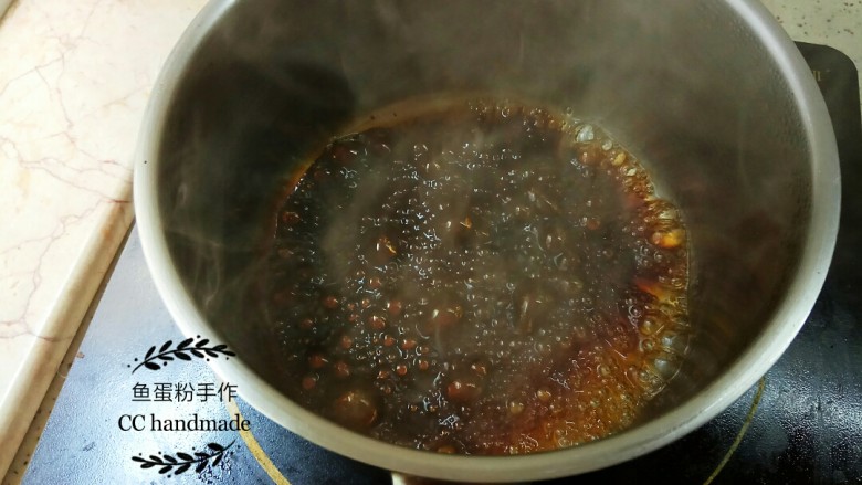 2. 2 看见奶锅里的糖逐渐变焦色时,马上加入一点点热水,这样的焦糖冷却后不会完全硬化,有点像酱的质感。如果喜欢硬硬的焦糖那就不用加热水,煮焦即可。