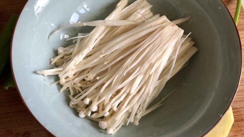 4. 金针菇隔着包装袋切去根部,清洗备用