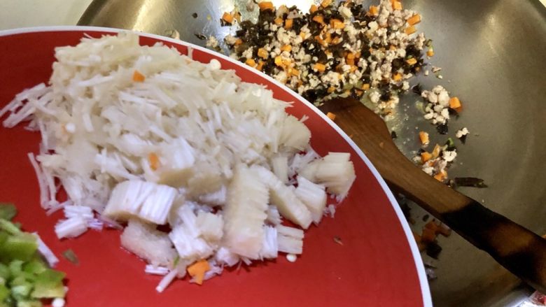 19. 蒸上豆腐后,我们来准备五彩肉末,热锅冷油,小火加入葱白姜末煸香