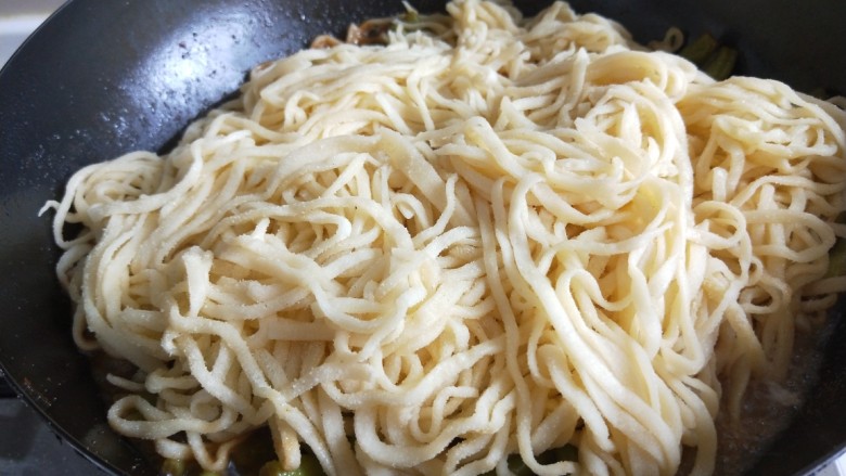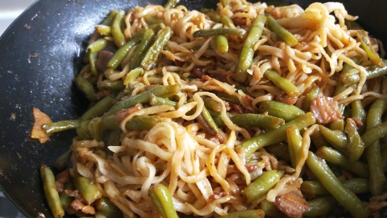 16. 在把手擀面放在豆角上,大火蒸10分钟。