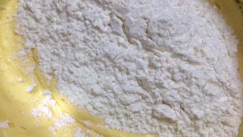7. 7.将低筋面粉和泡打粉倒入蛋糊中。