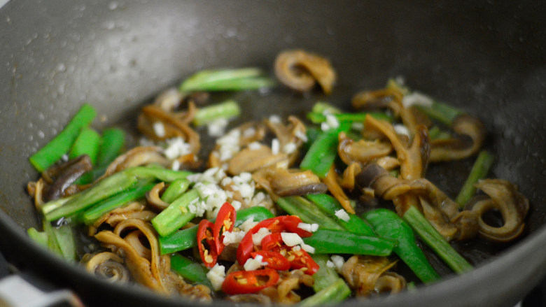 10. 放入蒜蓉和小米辣,翻炒均匀