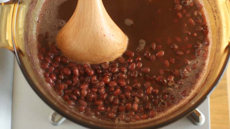 3. 将红豆和泡红豆的水倒入锅中,熬煮~