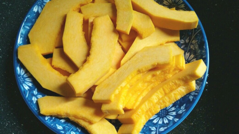 1. 南瓜去籽去皮,切成片,放锅里蒸熟