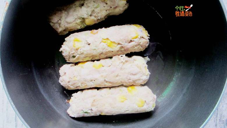 10. 扒开铝箔纸,将玉米肠放入锅内加入少许油煎至两件焦黄即可
