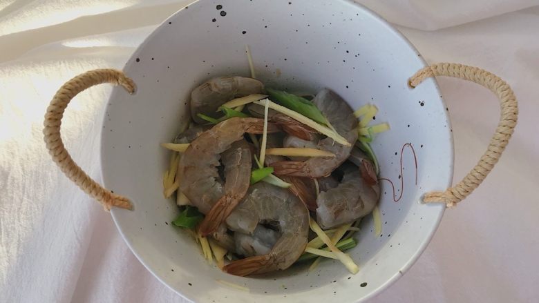 7. 将处理好的大虾放入比较深的容器 依次倒入料酒 葱丝和姜丝